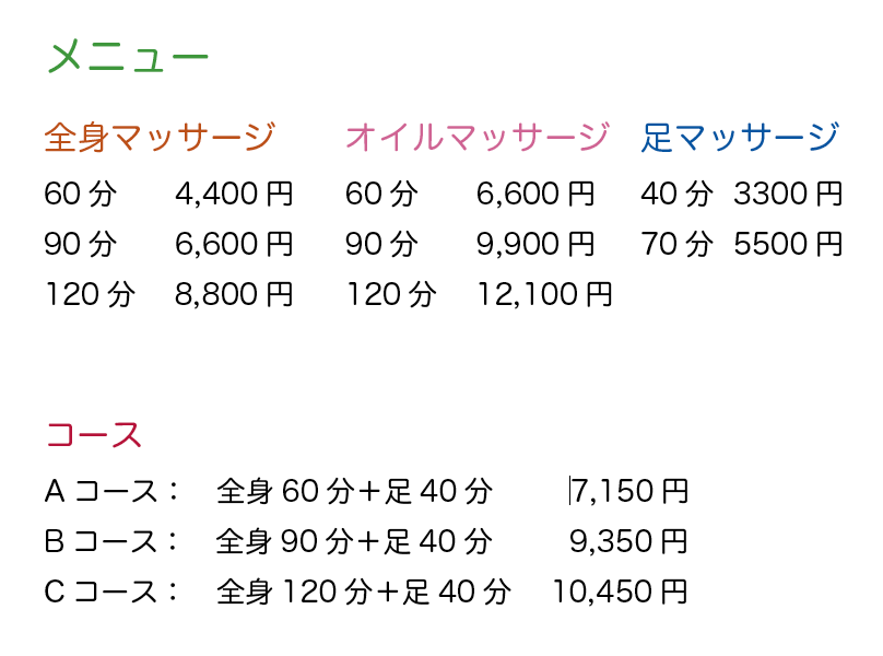 about ナムティプ タイの古式マッサージは、ヨガと同じ。 手足など関節の動きをスムースになるよう筋肉のバランスを整えます。 体をリラックスさせることで、心を平常な穏やかな常態にもどします。 人はちょっとしたストレスから、体が緊張するもの。心と体は一体です。体の凝りや痛みは、イライラしたり怒りっぽくなったり、心配しやすくなる原因にもなります。 血行をよくし、体の余計な緊張をほぐすことで、体も心も穏やかになります。
